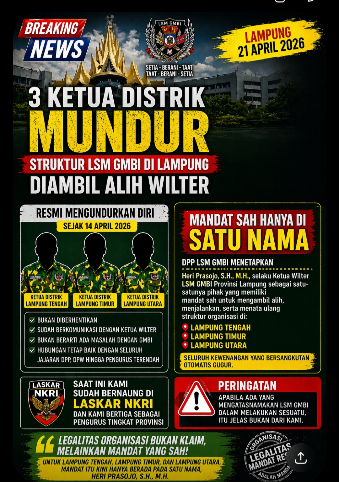 Lampung, 21 April 2026 — Dinamika internal organisasi kembali terjadi di tubuh LSM GMBI. Tiga Ketua Distrik dari wilayah Lampung Tengah, Lampung Timur, dan Lampung Utara secara resmi menyatakan pengunduran diri dari keanggotaan LSM GMBI.